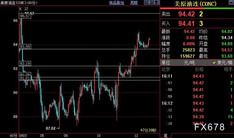 北京时间16:16,NYMEX原油期货下沉0.02%至94.32美元/桶;ICE布伦特原油期货上涨0.25%至99.82美元/桶。